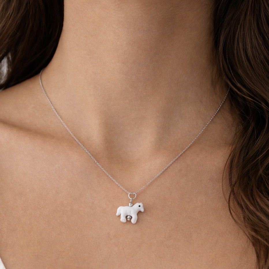 The horse is crafted in delicate ceramic and hangs from a pendant in 925 sterling silver. It is a celebration of the Horse’s spirited, confident and energetic nature.